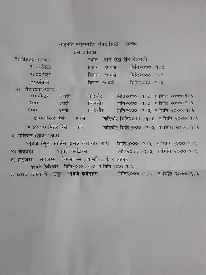 राष्ट्रपति रनिङसिल प्रतियाेगिता मिति २०७८ बैशाख ५ र ६ गने तम्घासमा सन्चालन हुने छ । काेभिड १९ काे कारण स्थगित भएकाे खेलकुद सन्चालन हुने भएकाे हाे ।